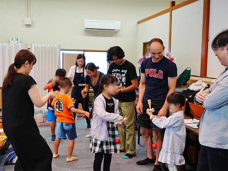 イベント終了後、外国の方々と子ども達でケン玉などをして楽しみましたが、ケン玉は難しかったよう。