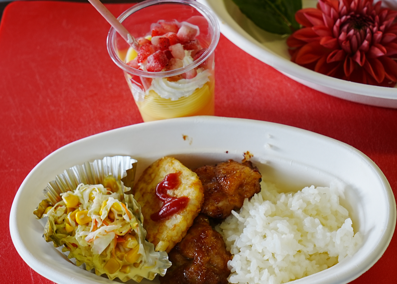昼食は照り焼きチキン、ポテトとコールスロー、デザートはプリンパフェです。