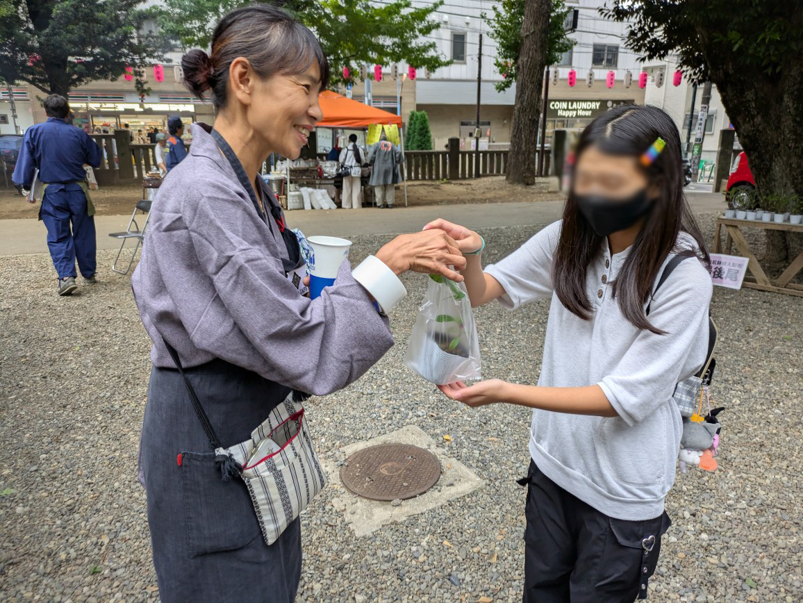 子どもたちは残りの千日紅ポットを、通る方々、目が合う方々などに声をかけ、なんと500ポットの配布を完了。