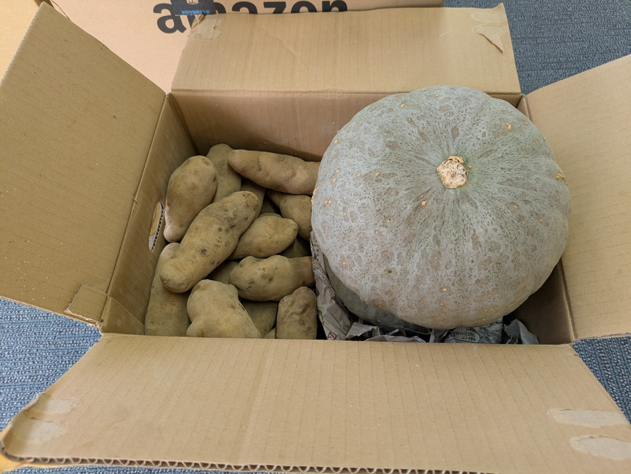 女性スタッフの北海道のご友人がじゃが芋、カボチャを贈ってくださいました。