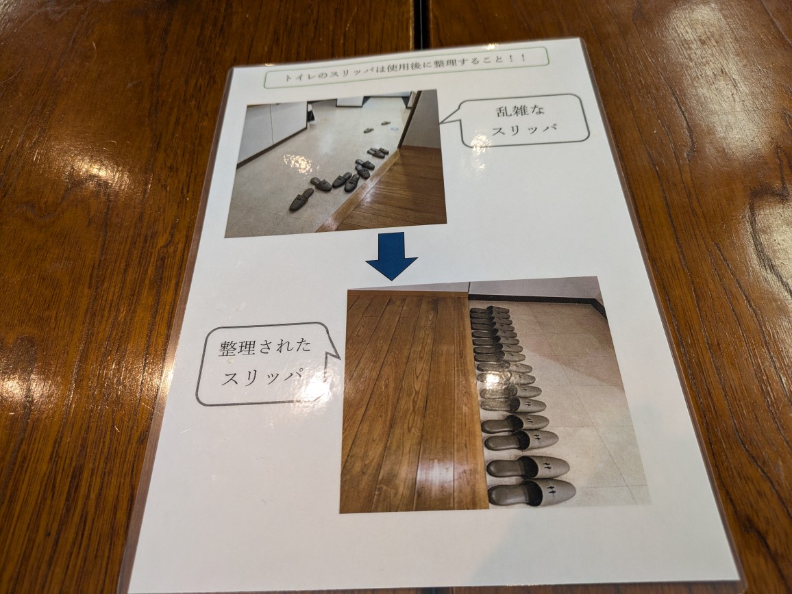 以前したお約束ですが、再度、子ども達とお約束をしました。「トイレのスリッパを使用後に整頓する」「食事後、帰る前に食器を片付ける」の2つです。根気よく見て行くことにします。