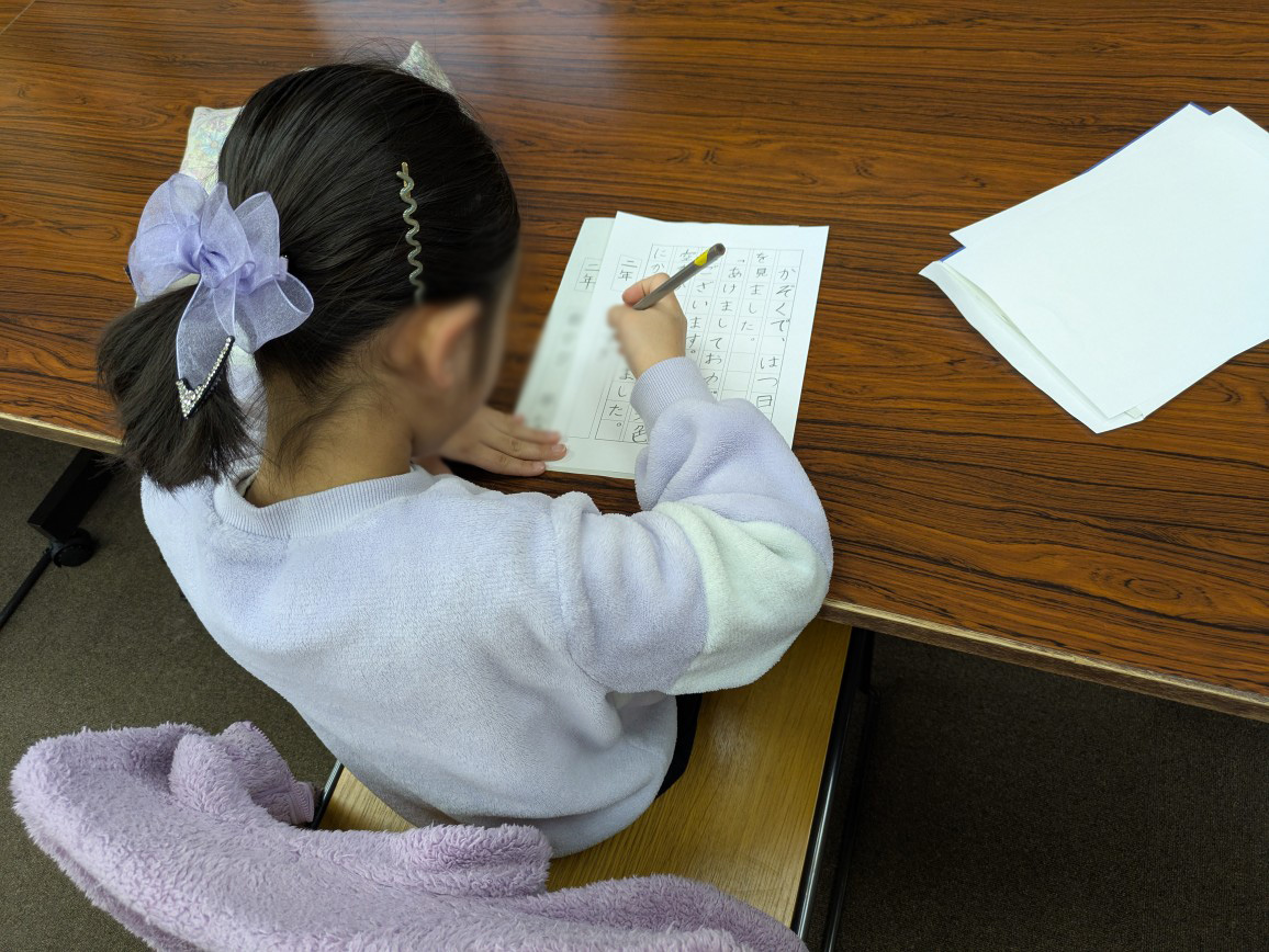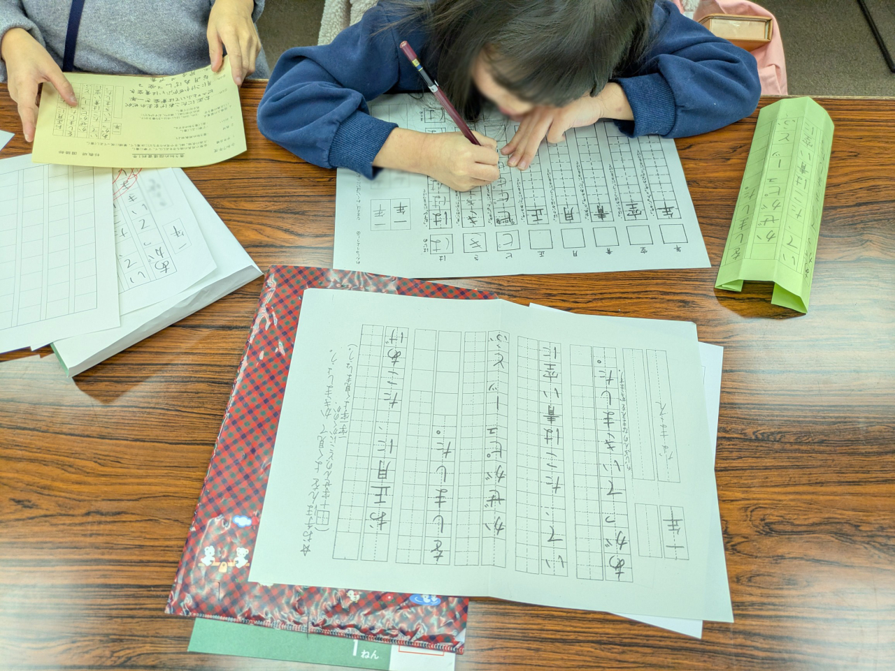 硬筆習字では1年生は「お正月の凧あげ」に関する文章を、2年生は「家族で初日の出」に関する文章を清書しました。