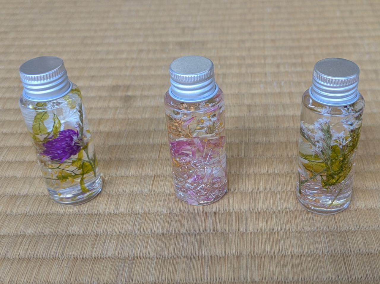次に瓶の中に選んだ花や飾りをピンセットを使用して好きな順序、場所に入れました。最後に瓶にオイルを入れて貰い完成します。