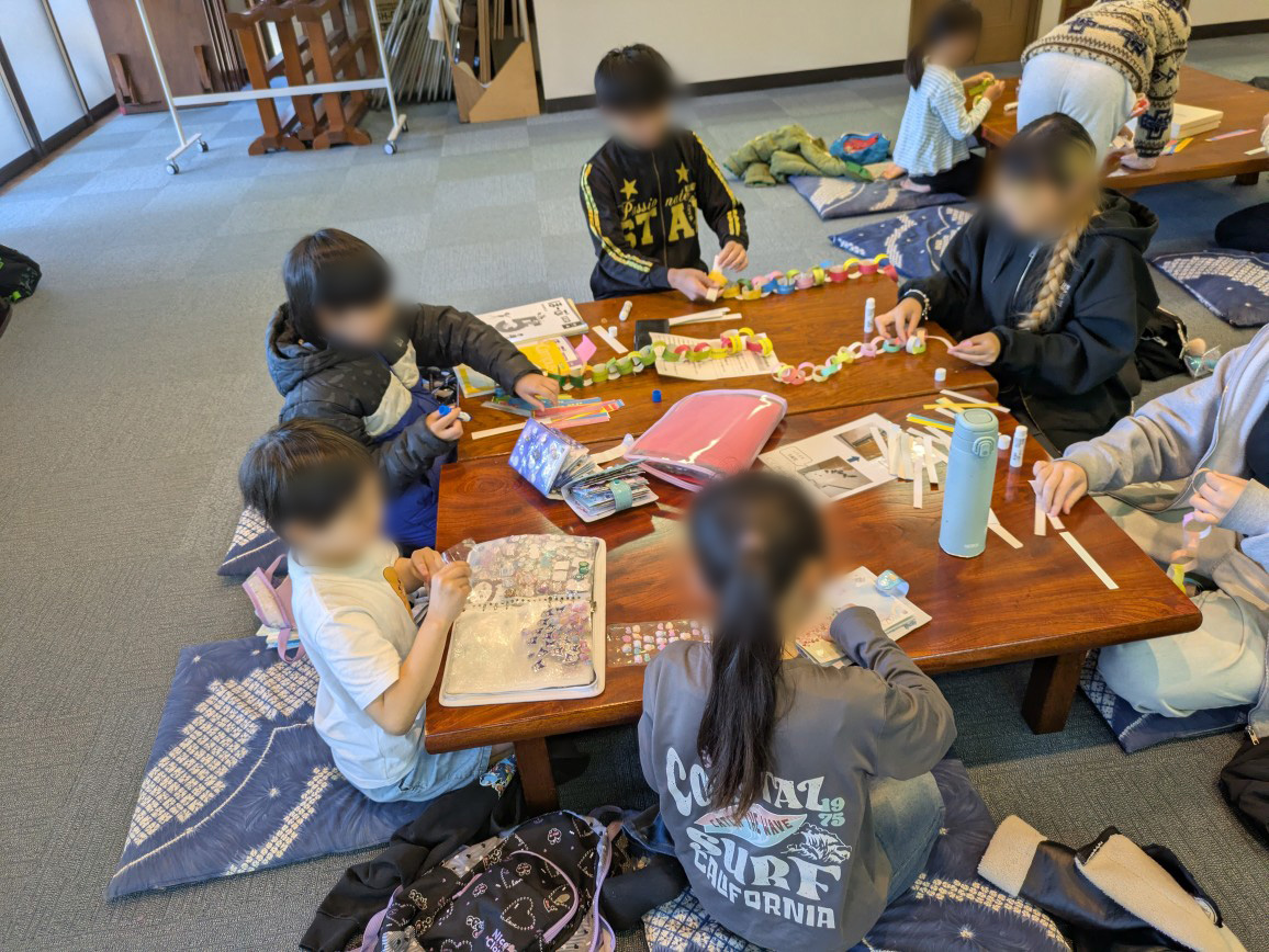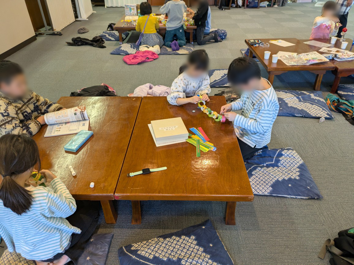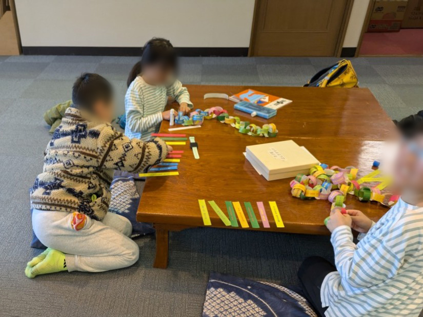 今日のメインは次回の寺子屋で予定している「卒業・進級お祝い会」を飾りつけるために「細く切った折り紙」の輪を繋げたリングづくりです。