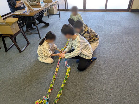 作業の終了後、床に並べて長さを比べました。やはり高学年チームの飾りが長く、景品をゲットし、大盛り上がりでした。